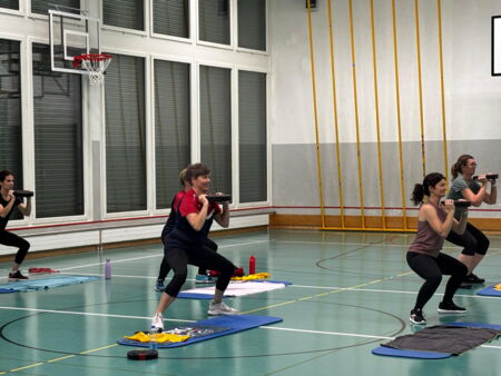 Unsere wöchentlichen Turnstunden gestalten wir hauptsächlich mit Konditions- und Krafttraining. Für abwechslungsreiche Trainings arbeiten wir mit Aerobic-Steppern, Therabändern, Balance-Pads, Gewichten, Langhanteln und vielen weiteren Hilfsmitteln. Alle Übungen sind für Anfänger bis fortgeschrittenes Niveau bestens geeignet. Die Turnstunden werden meistens kombiniert mit einfachen Aerobic-Kombis, Yoga- oder Pilatesübungen und Faszientrainings. Richtiges Einwärmen und abschliessendes Dehnen und Stretchen gehören genauso dazu wie das anschliessende «eis go zieh»😉